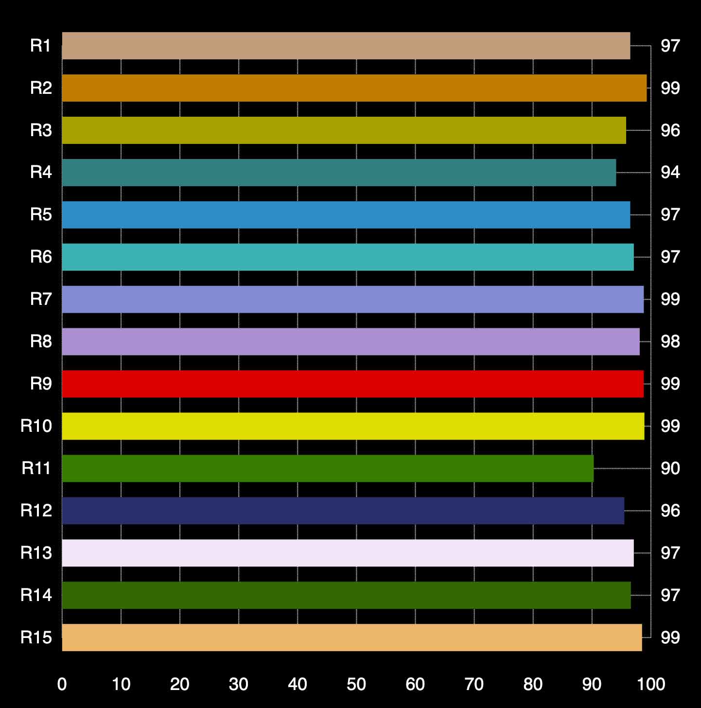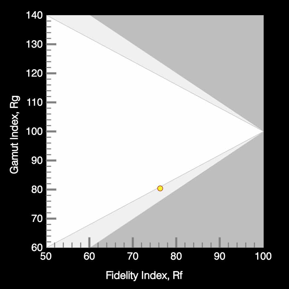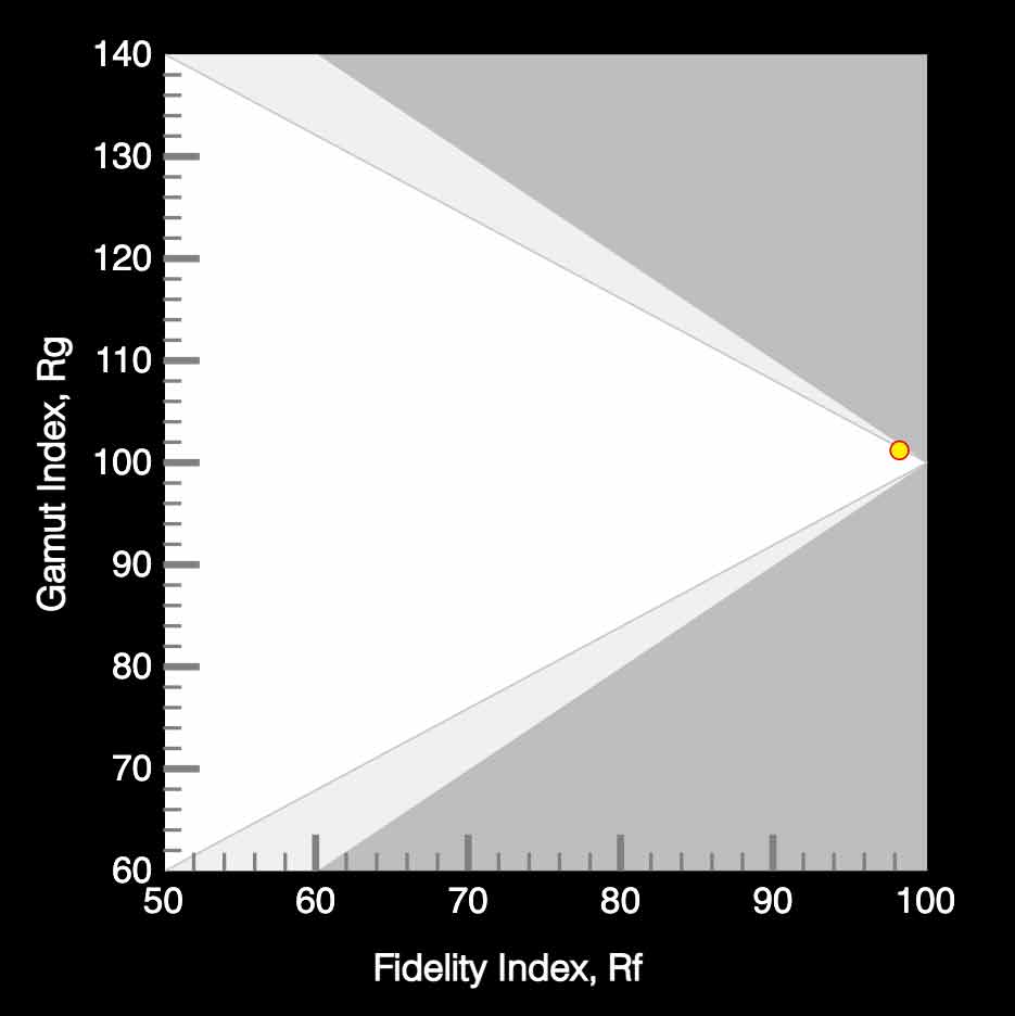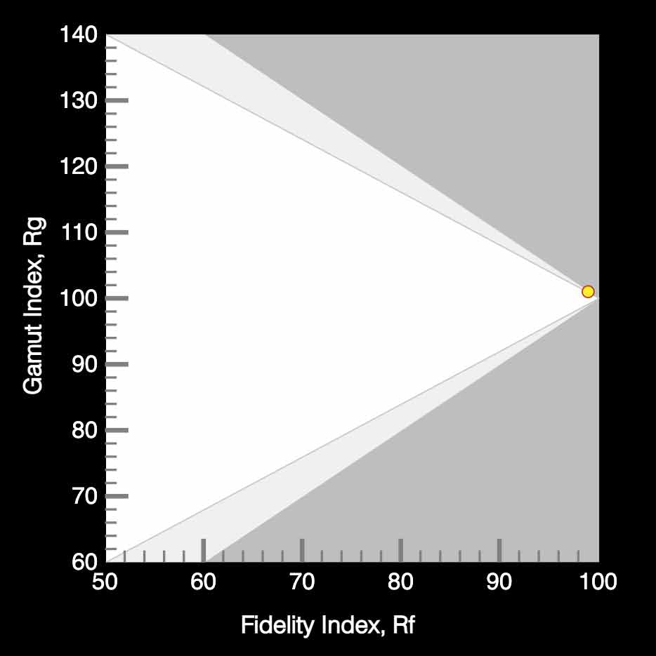 Rg - Gamut Index: An average of your light's saturation accuracy of all 99 samples; an ideal value being 100. Values below 100 suggest an average undersaturation (colours appear dull) and the opposite for values over 100. Refer to the charts below to see how each light source performs.