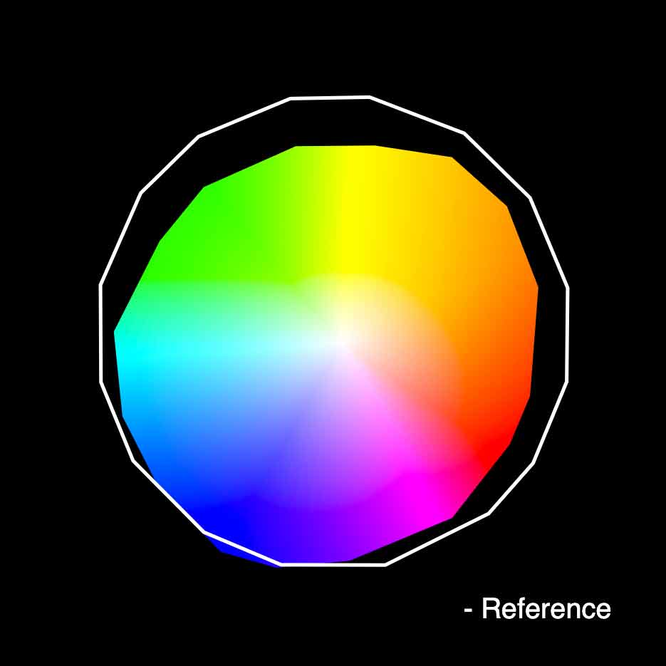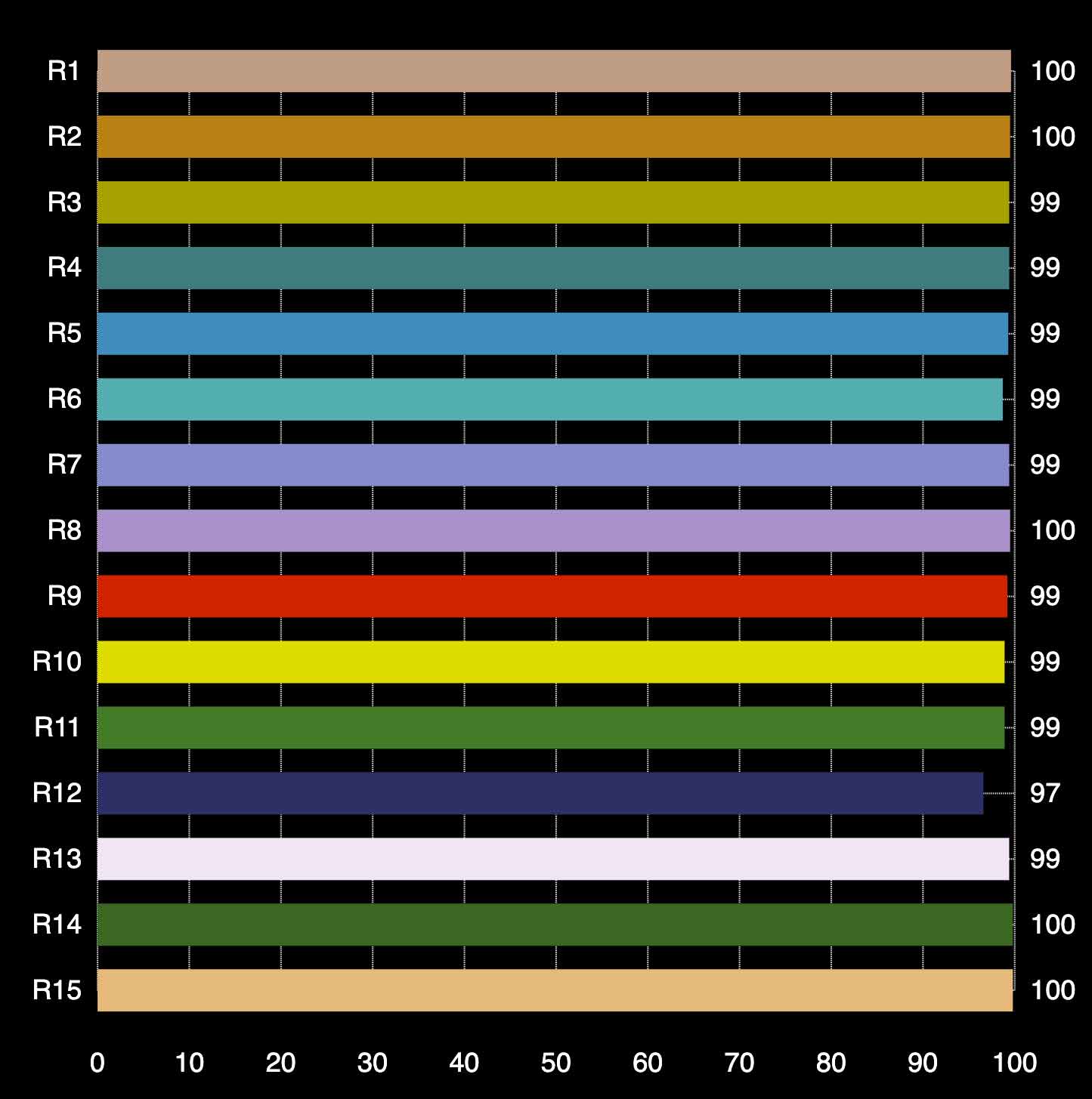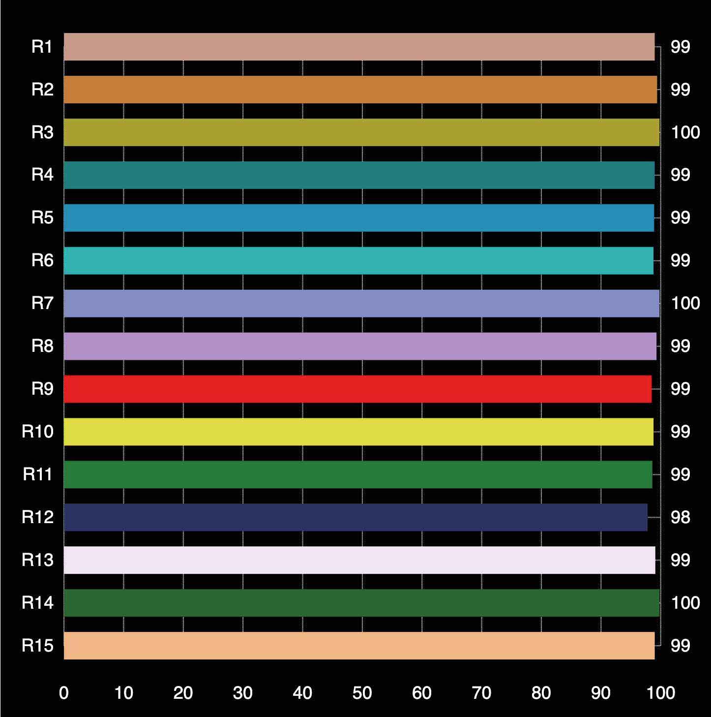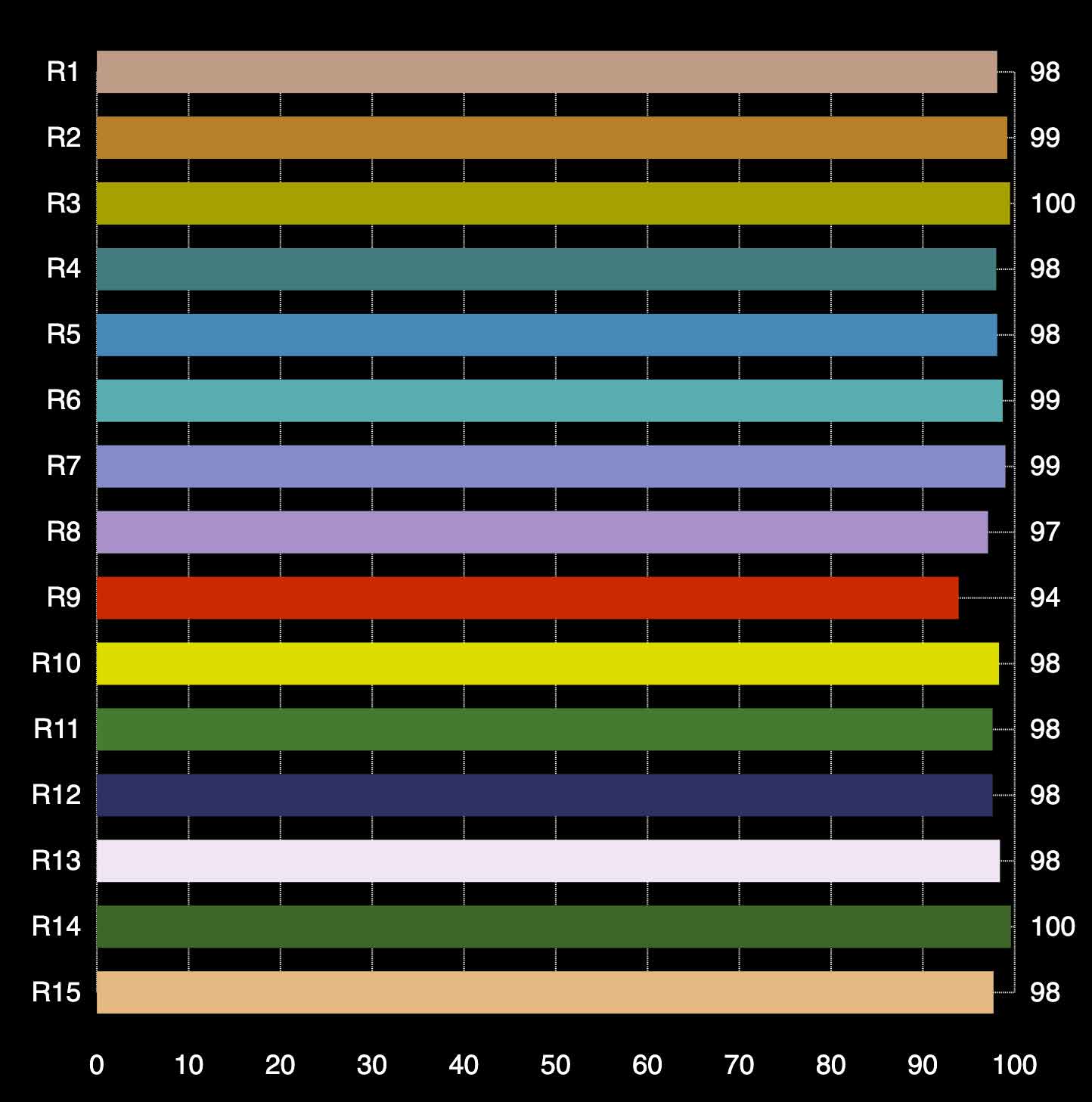Rg - Gamut Index: An average of your light's saturation accuracy of all 99 samples; an ideal value being 100. Values below 100 suggest an average undersaturation (colours appear dull) and the opposite for values over 100. Refer to the charts below to see how each light source performs.