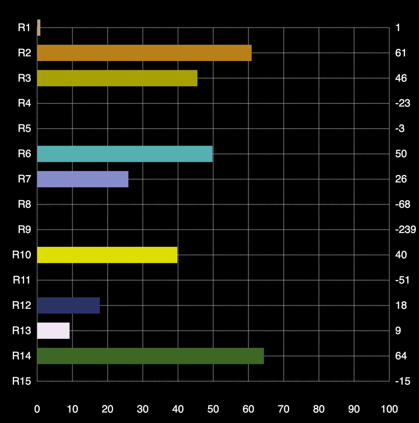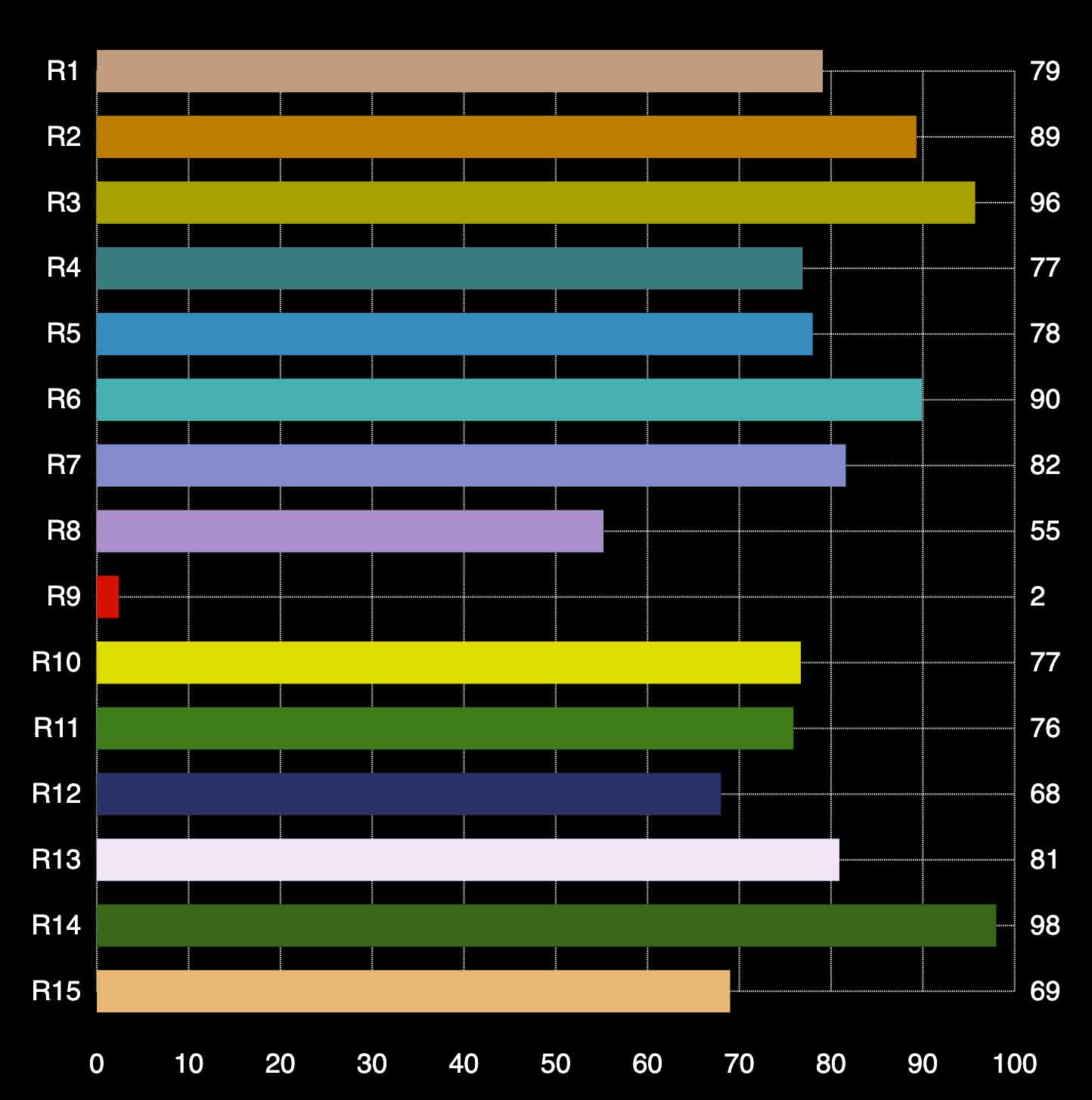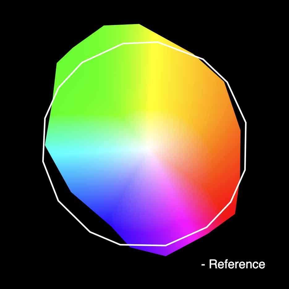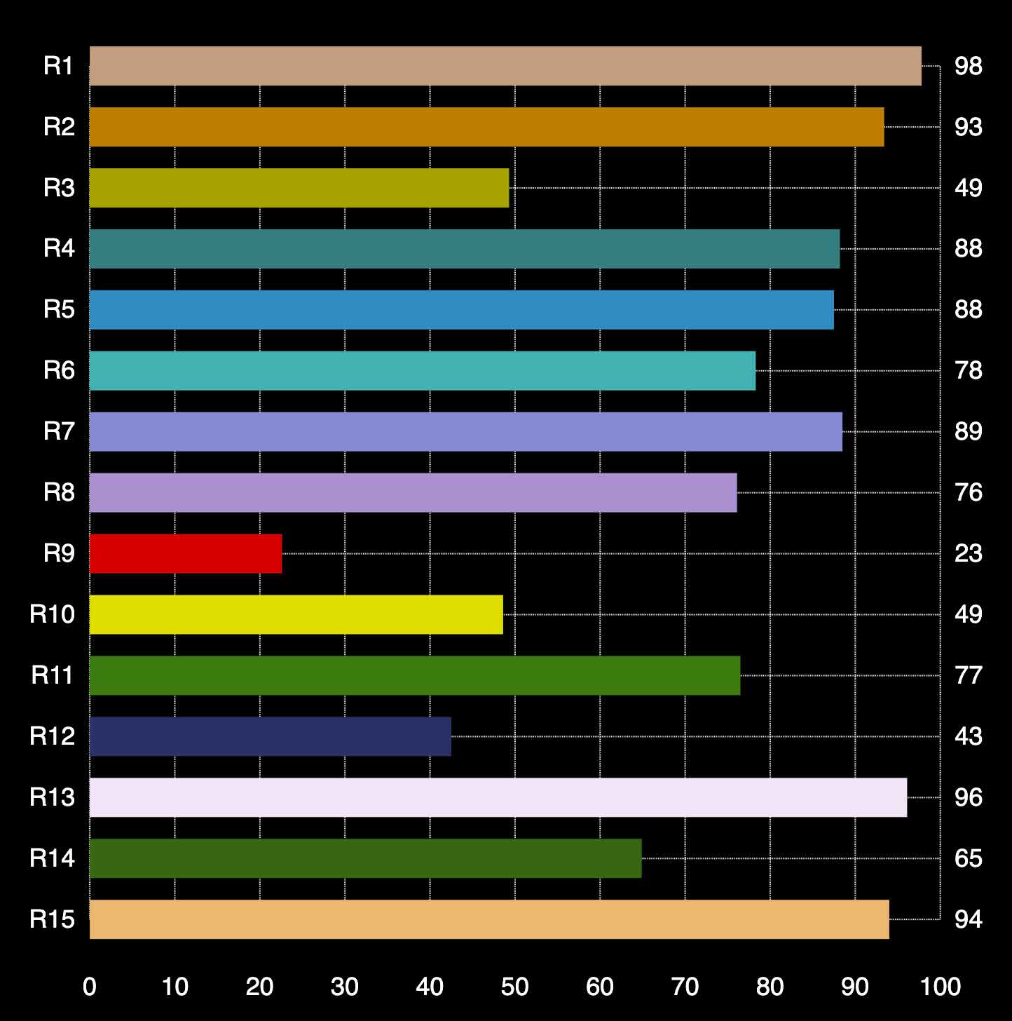Rg - Gamut Index: An average of your light's saturation accuracy of all 99 samples; an ideal value being 100. Values below 100 suggest an average undersaturation (colours appear dull) and the opposite for values over 100. Refer to the charts below to see how each light source performs.