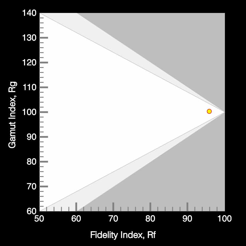 Rf - Fidelity Index: An average (from 0 - 100) of your light's comparative ability to accurately render all 99 colour samples (hue), similar to CRI(Re).
