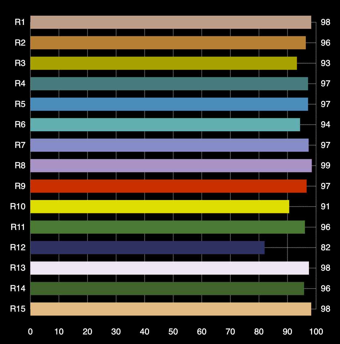 R9 (deep red) is the most critical colour as it is responsible for the accurate appearance of skin tones as well as most natural objects. It is also the most difficult colour for any LED light source to render.