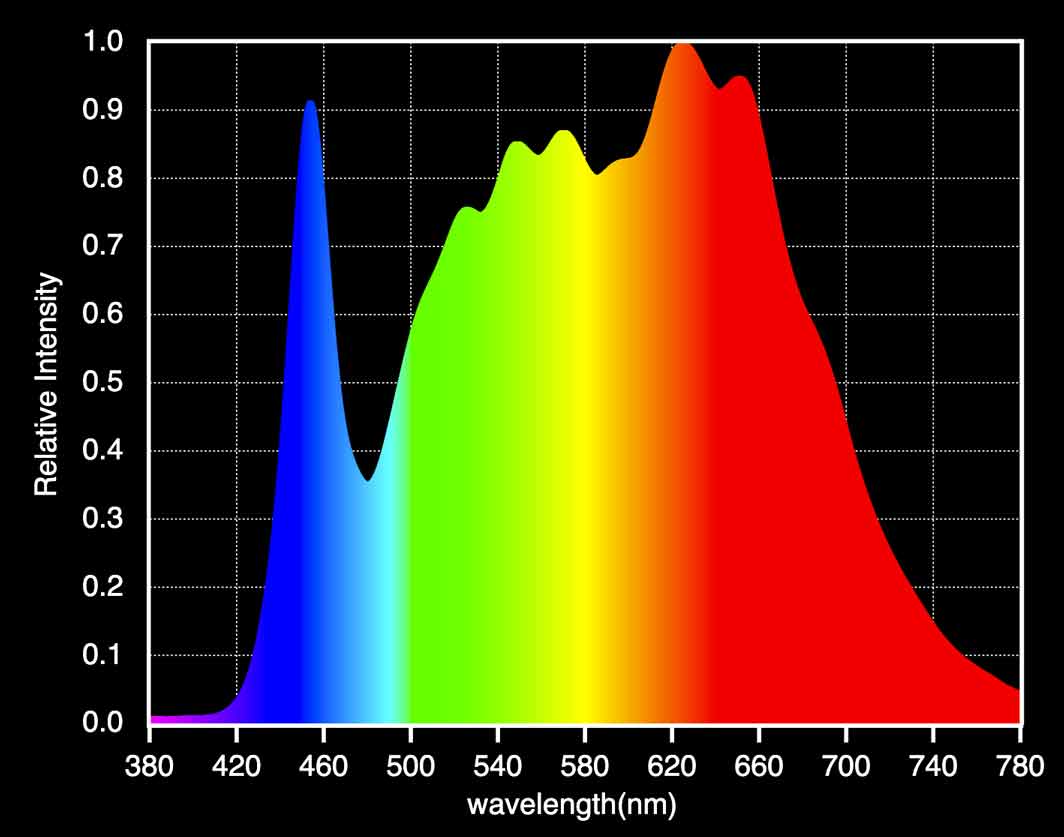 Wavelengths between 380 - 400nm (Ultraviolet) & 700 - 780nm (Infrared) are produced with minimal intensity, both eliminating harmful light and saving energy. The visible colour spectrum for humans is about 400 - 700nm.